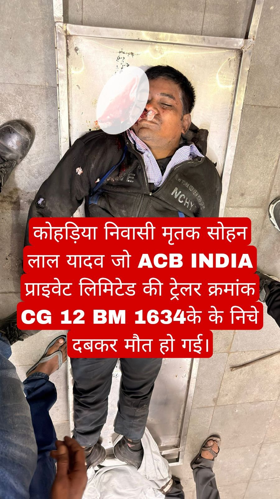 ACB इंडिया प्राइवेट लिमिटेड के ही कर्मचारी सोहन लाल यादव जो की कोहड़िया में निवासरत थे। जो आज काम खत्म होने उपरांत घर जा रहा था तभी कटघोरा रोड दीपका में ACB इंडिया प्राइवेट लिमिटेड की ही ट्रेलर क्रमांक CG 12 BM 1634 के निचे दबकर युवक की घटना स्थल पर ही मौत हो गई।