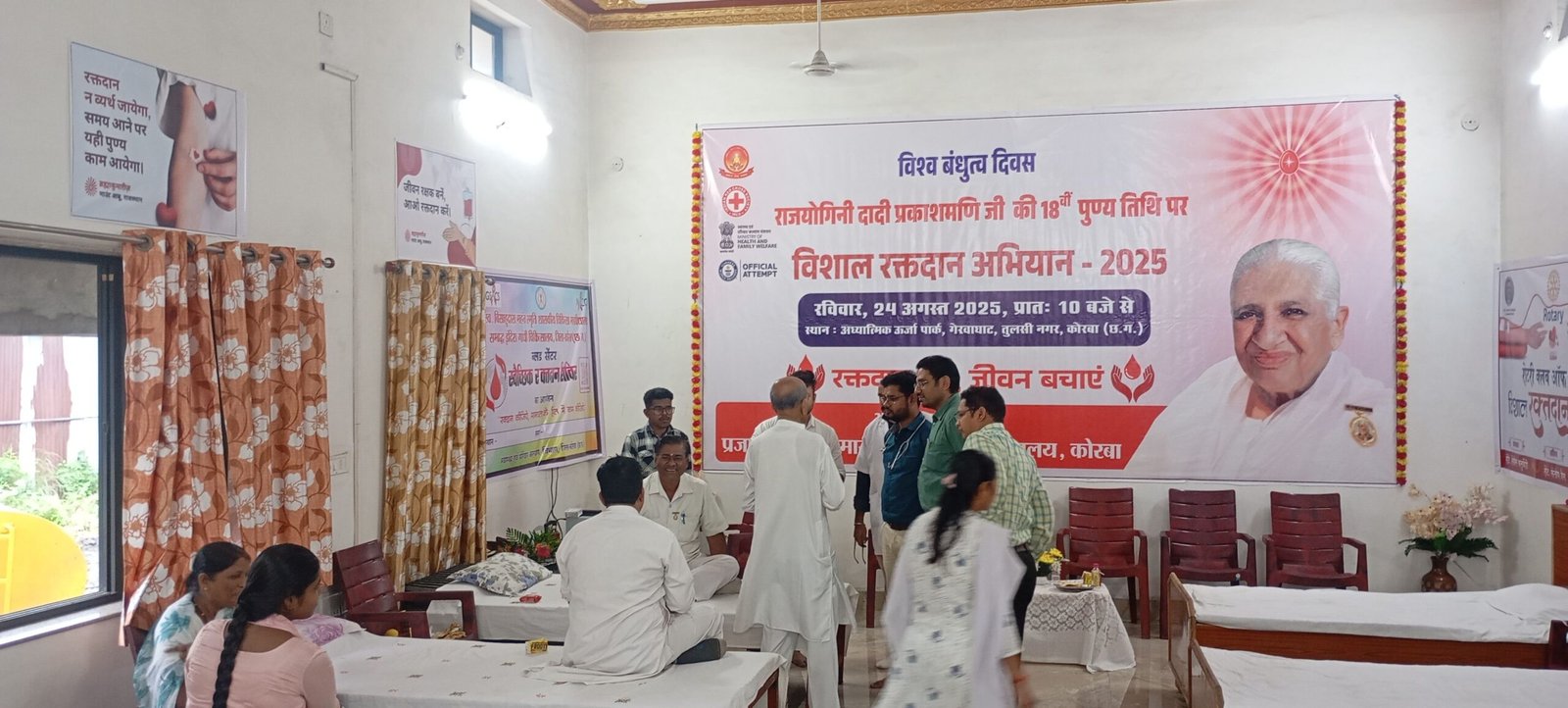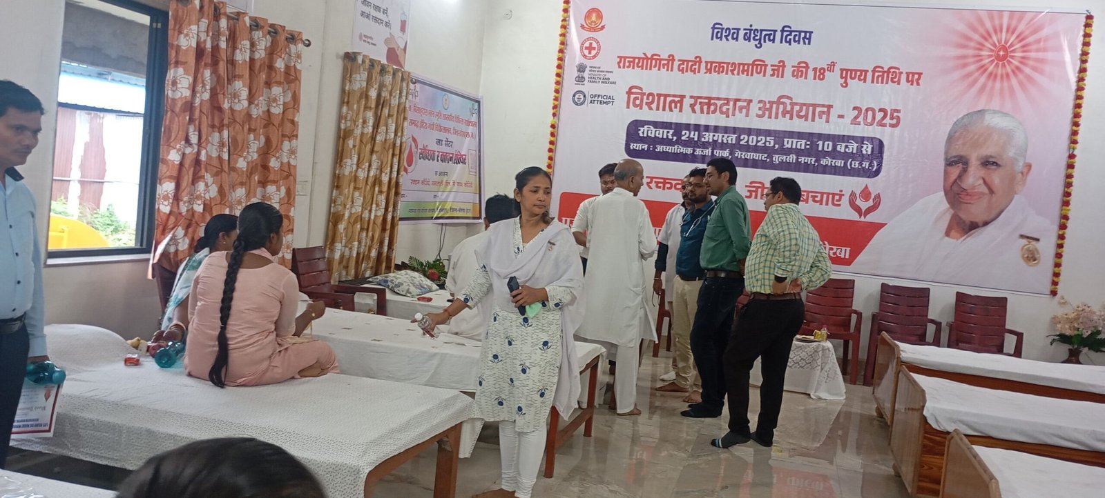 प्रजापिता ब्रह्माकुमारी ईश्वरीय विश्वविद्यालय के तत्वधान में संस्था की पूर्व मुख्य प्रशासिका राजयोगिनी दादी प्रकाशमणि जी की 18वीं पुण्यतिथि के अवसर पर आज आध्यात्मिक ऊर्जा पार्क, गेरवाघाट में एक विशाल रक्तदान शिविर का आयोजन किया गया साथ ही विश्व बंधुत्व दिवस का कार्यक्रम भी किया गया |