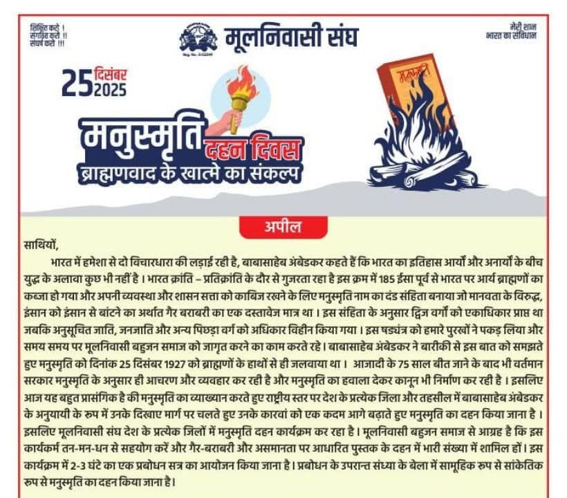ज्ञात हो की बाबा साहेब भीमराव अम्बेडकर जी नें 25 दिसंबर 1927 को मनुस्मृति का दहन कर अमानवीय बेड़ियों से समाज को मुक्त किए थे। जिसकी यादगार में 25 दिसंबर को प्रतिवर्ष मूलनिवासी समाज मनुस्मृति दहन दिवस बड़े ही धूमधाम के साथ उत्सव के रूप में मनाता है। मूलनिवासी संघ जो की ST/SC/OBC के हक अधिकारों को लेकर राष्ट्रीय स्तर पर संघर्षरत गैर राजनैतिक सामाजिक रजिस्टर्ड संगठन है।