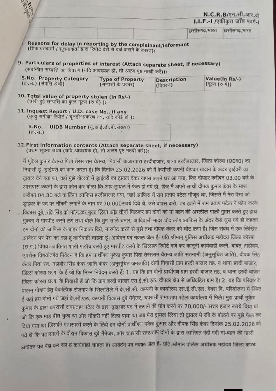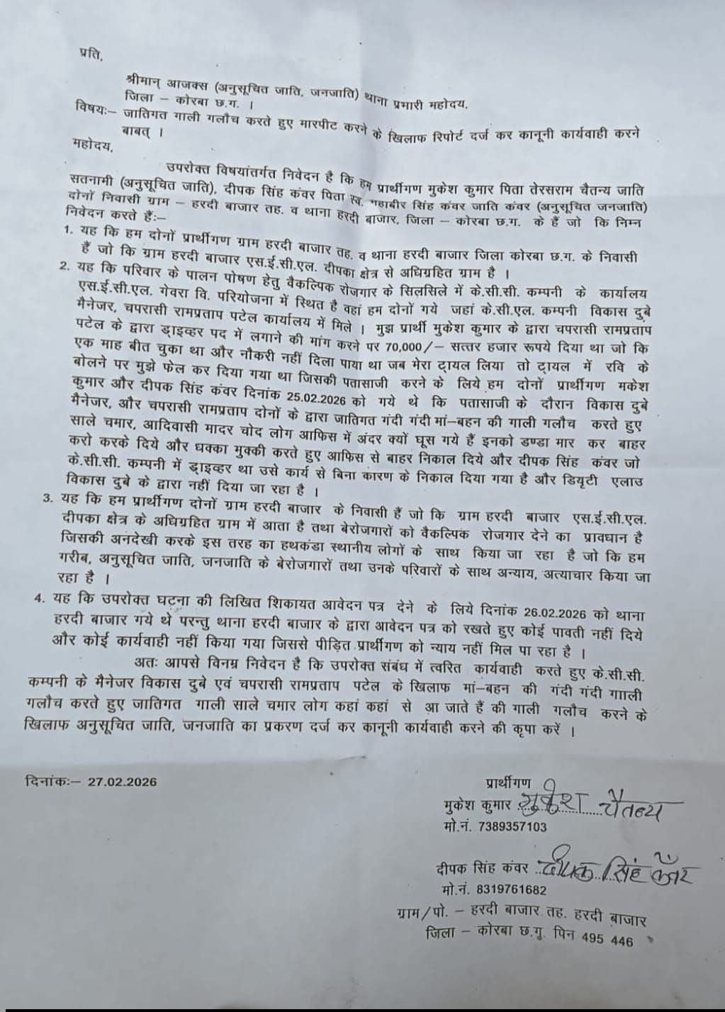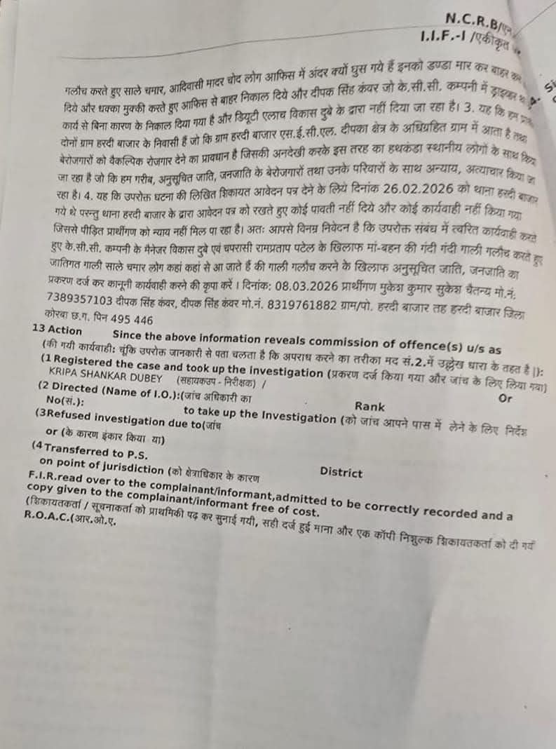 एसईसीएल (SECL) दीपका परियोजना में कार्यरत निजी कंपनी के.सी.सी. (KCC) के अधिकारियों द्वारा स्थानीय ग्रामीणों से नौकरी के नाम पर ठगी मारपीट और जातिगत अपमान का सनसनीखेज मामला सामने आया है हरदीबाजार पुलिस ने पीड़ितों की शिकायत और उच्चाधिकारियों के हस्तक्षेप के बाद कंपनी के मैनेजर सहित अन्य कर्मचारियों के विरुद्ध भारतीय न्याय संहिता (BNS) और SC/ST एक्ट की गंभीर धाराओं के तहत मामला दर्ज कर लिया है ।