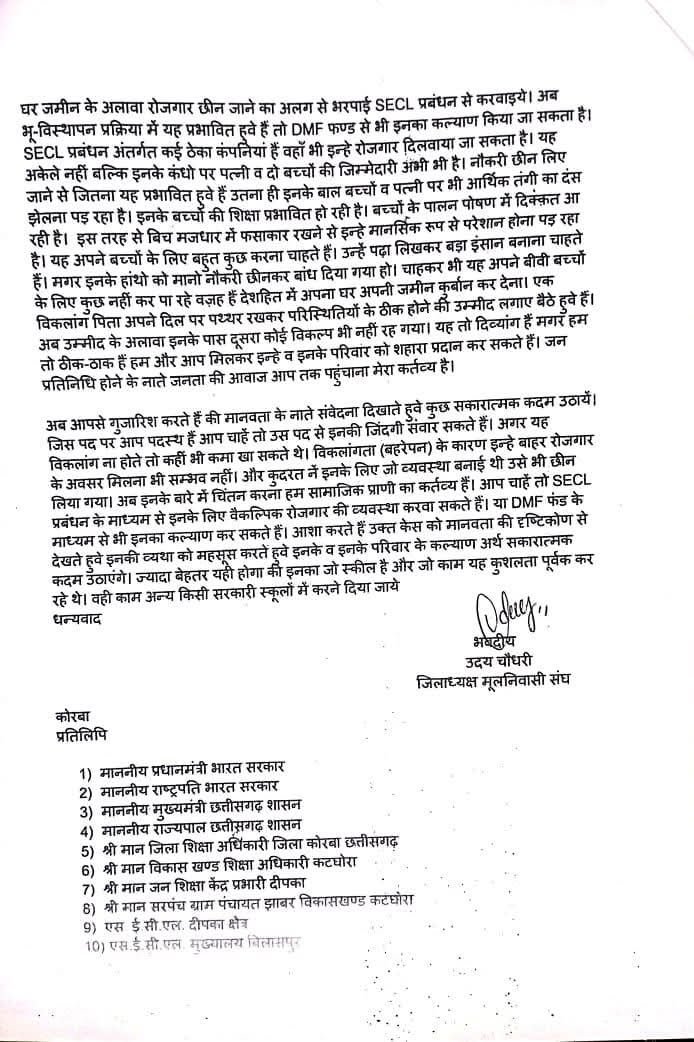 चुंकि वह आदिम जाती प्राथमिक शाला में सफाई कर्मी के तौर पर अंशकालीन रूप से पदस्थ थे तो पहली प्राथमिकता तो यही रहेगी की उन्हें किसी आदिम जाती प्राथमिक शाला में सफाई कर्मी के रूप में पदस्थ किया जाये। दूसरा विकल्प यह भी है की जिलाधीश महोदय SECL के माध्यम से उनका कल्याण करवाएं क्योंकि आखिरकार उनका जन जीवन SECL द्वारा किए जा रहे भू अधिग्रहण प्रक्रिया से प्रभावित हुआ है। तो रोजगार प्रभावित होने के एवज में SECL मुआवजा देकर उसकी भरपाई करे या फिर किसी ठेका कंपनी में उन्हें सफाई कर्मी का पद देकर उनका कल्याण करे
