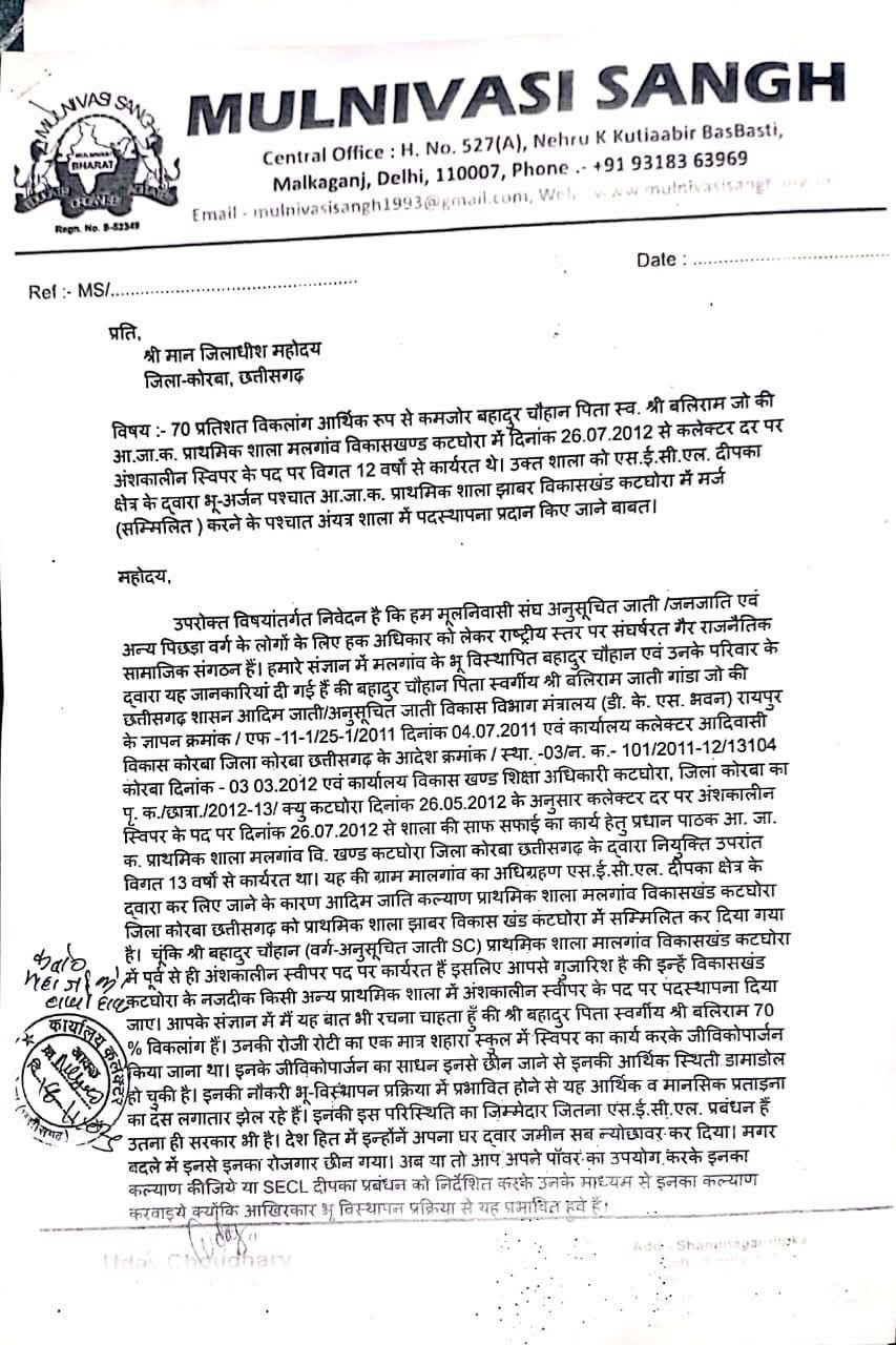बहादुर चौहान ने जिलाधीश कोरबा से लगाई गुहार