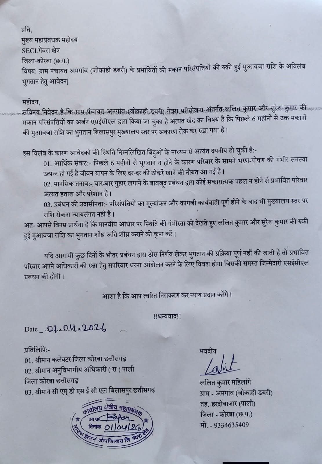 ०२. न्याय के लिए पिता का संघर्ष:- ग्राम अमगांव के ही जोहनराम निर्मलकर ने बताया कि उनकी दिवंगत पुत्री स्व. लता के नाम पर निर्धारित मुआवजा राशि 3 साल बीत जाने के बाद भी नहीं मिली है उन्होंने घोषणा की है कि यदि समाधान नहीं हुआ तो वे 11 अप्रैल 2026 से अपने पूरे परिवार के साथ मुख्य महाप्रबंधक कार्यालय के समक्ष अनिश्चितकालीन धरने पर बैठेंगे ।