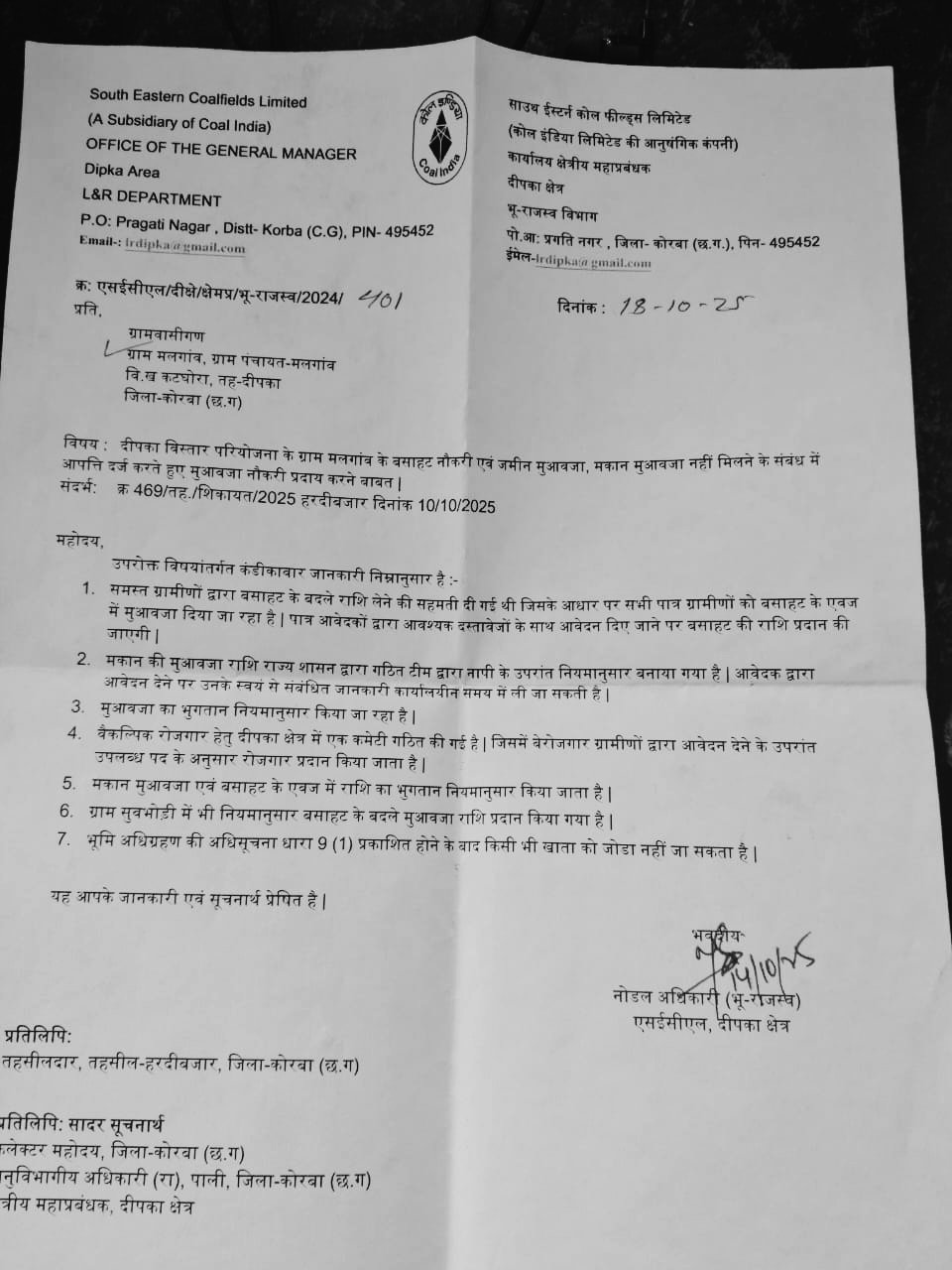 10/10/2025 को ग्राम हरदी बाजार में मलगांव वासियों नें SECL को जो पत्र दिया था 2 महीने उपरांत उसका जवाब आया है। पत्र में जोबातें लिखी गई हैं वह दुनियां के नंबर वन घोटाले बाज कंपनी के रूप में SECL को खड़ा करती हैं।