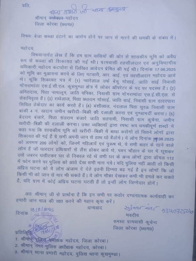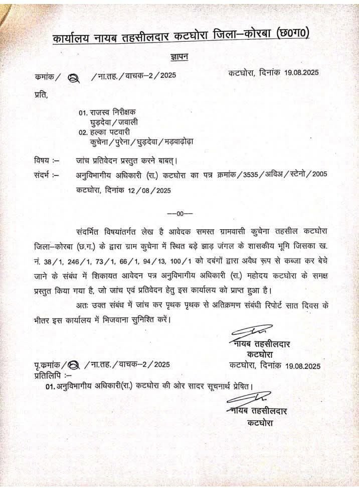 कुचेना के ग्राम वासियों ने कुसमुंडा थाना प्रभारी के समक्ष लिखित शिकायत की है की गांव के वन विभाग की भुमि पर कई लोगों की नजर है जो यहाँ के भुमि को कब्जा करने के लिए सक्रिय है।